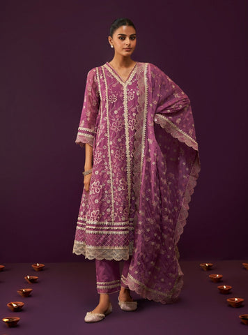 This Elegant Kurta Set Is A Celebration Of Timeless Grace In Its Regal Hue. The Kurta Is Adorned With Delicate Floral Embroidery In Stunning Golden Thread. The Sleeves With Scalloped Lace Detailing Exude A Touch Of Femininity. Paired With Straight Pants Featuring Intricate Hem Detailing, The Set Is Perfect For Festive Occasions And Intimate Gatherings. The Matching Dupatta, With Its Stunning Borders And Intricate Embroidery, Wraps You In Elegance, Making This Ensemble A Must-Have For Those Who Cherish Timeless Luxury.