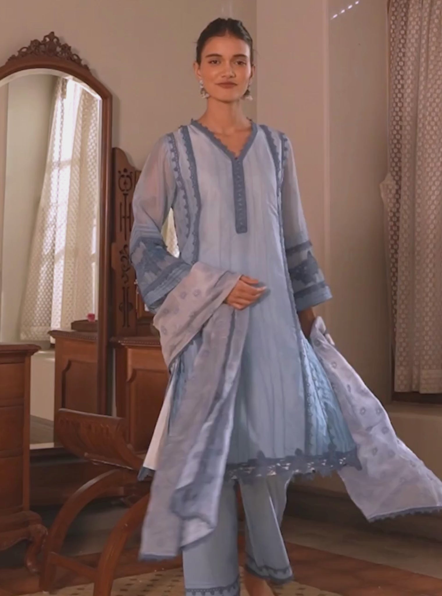 A Mesmerizing Straight Kurta Set, Reminiscent Of A Summer Skyæ??S Serene Hues With Its Graceful Blue Ombre. Delicate Lace Accents Adorn The Neckline And Sleeves, While A Broad Lace Border At The Hem Adds An Enchanting Touch, Transforming This Simple Kurta Into A Summertime Masterpiece. The Sleeves Feature Intricate 3D Lace Floral Applique, Further Enhancing Its Ethereal Allure.