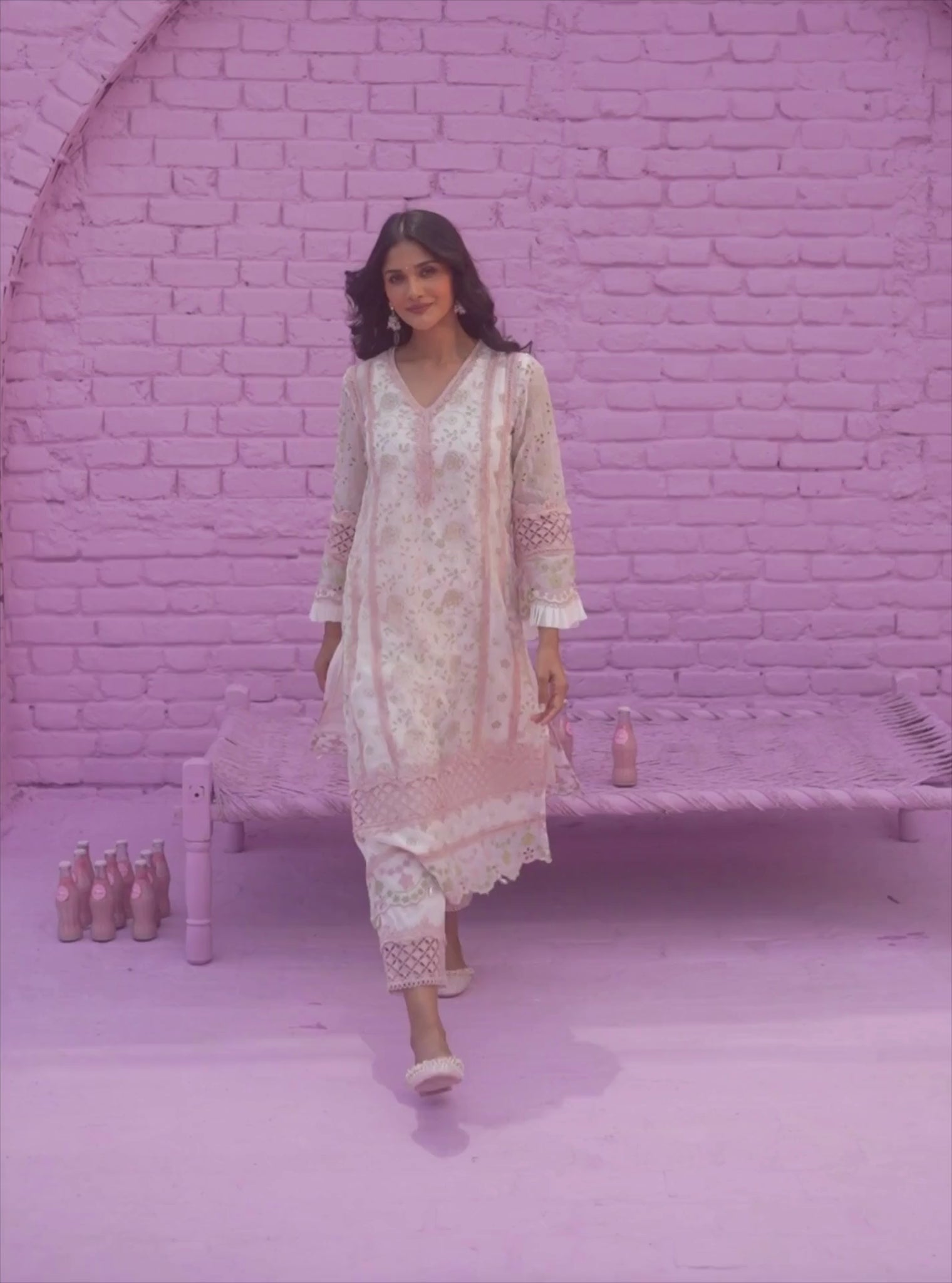 A Very Delicate And Whimsical Kurta Set In A Sophisticated Off-White Shade. Delicate Green Thread Embroidery Creates A Subtle Contrast On The Base. The V-Neckline Is Adorned With Pink Lace Trim, While The Slightly Flared Sleeves Are Pleated And Adorned With Stunning Pink Lace. The Hem Of The Straight Kurta Is Scalloped With Dainty Pearl Hangings. It Is Paired With Straight Pants Featuring The Same Lace Panel At The Cuff. Complete The Set With A Stunningly Embroidered Dupatta That Adds To The Whimsical Feel Of The Ensemble.