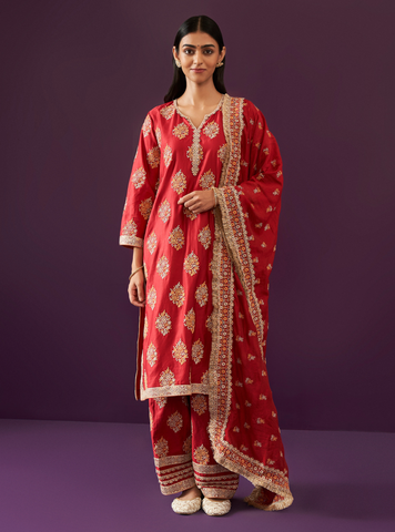 A Traditional Red Kurta Set, With Regal Embroidery! The Straight Kurta Features A Notched Neckline, Accentuated With Delicate Lace. The Traditional Embroidery Motif All Over The Kurta Gives It A Timeless Appeal, Making It Appropriate For A Multitude Of Occasions. Lace Tra=Ims Adorn The Hemline Of The Kurta, And The Cuffs Of The Matching Straight Pants. Complete The Ensemble With A Matching Dupatta, Featuring A Gotta Fringe Border.